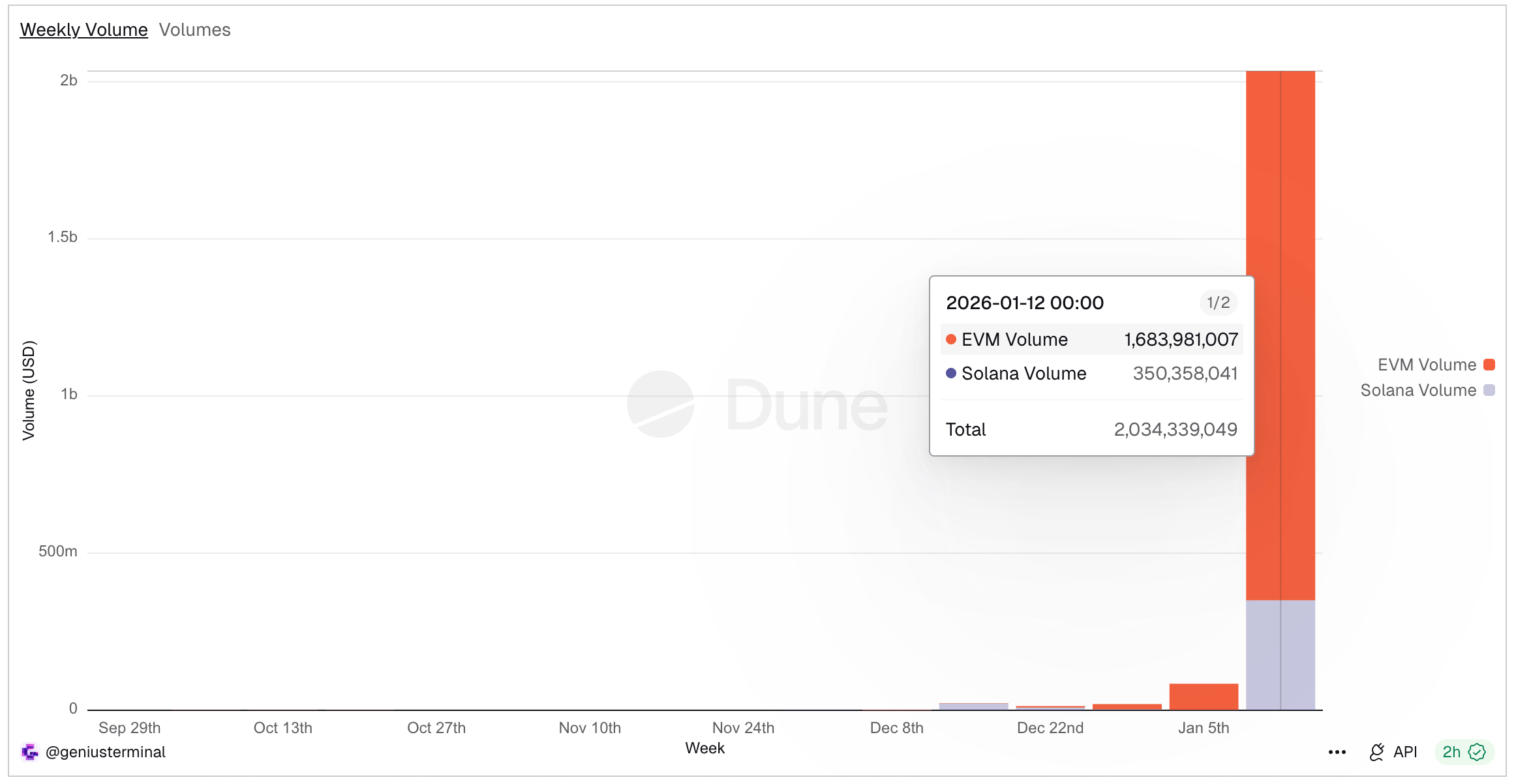 The platform has now surpassed $2 billion in weekly volume, according to the data, compared to just about $85 million a week before. The average user appears highly active, clocking in at around $82,400 in trading volume per wallet, a figure that was almost nonexistent before.
