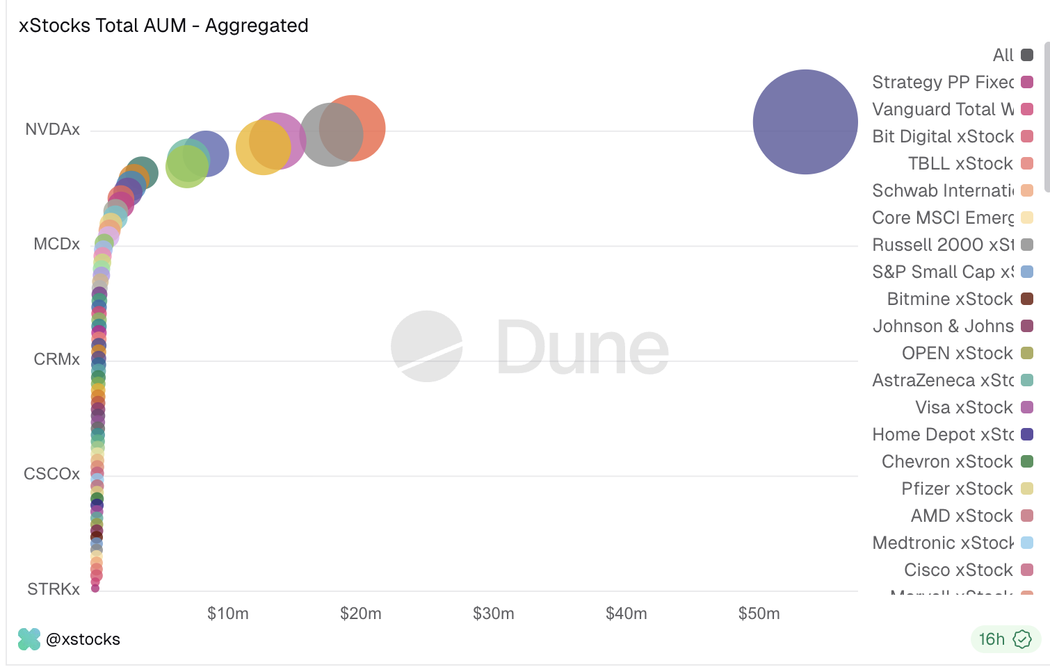 Other names like AMZNx, MSFTx, and STRCx are pulling in between $1 million to $1.5 million, with supply ranging from a few thousand to over ten thousand tokens. Lower-tier names like MCDx, UNHx, PLTRx, and GMEx still hold six-figure AUM, even with fewer than 3,500 tokens each.