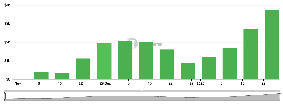 Launched in October, TradeXYZ started to take off at the end of November after Hyperliquid rolled out its “growth mode” upgrade, which reduced fees on HIP-3 permissionless perpetuals markets by over 90%, leading to a spike in volumes.