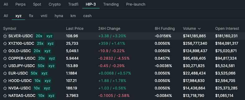 The breakout in volume and open interest comes as precious metals continue to rally, with the SILVER/USDC pair commanding $740 million in volume over the last day, almost three times the platform’s flagship asset, XYZ100, which represents Nasdaq futures.