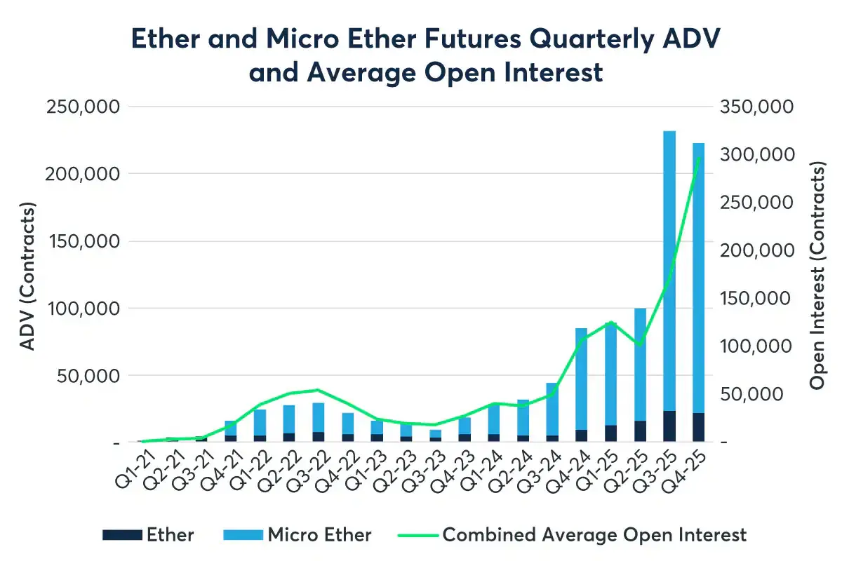 Trading momentum accelerated in Q4, with open interest doubling against Q4, 2024. The CME market has a widened participant base, with a record of 1,039 holders of large open interest, an all-time record as of October 21, 2025. The exchange saw its participant base increase, together with other mainstream activities such as ETF trading.