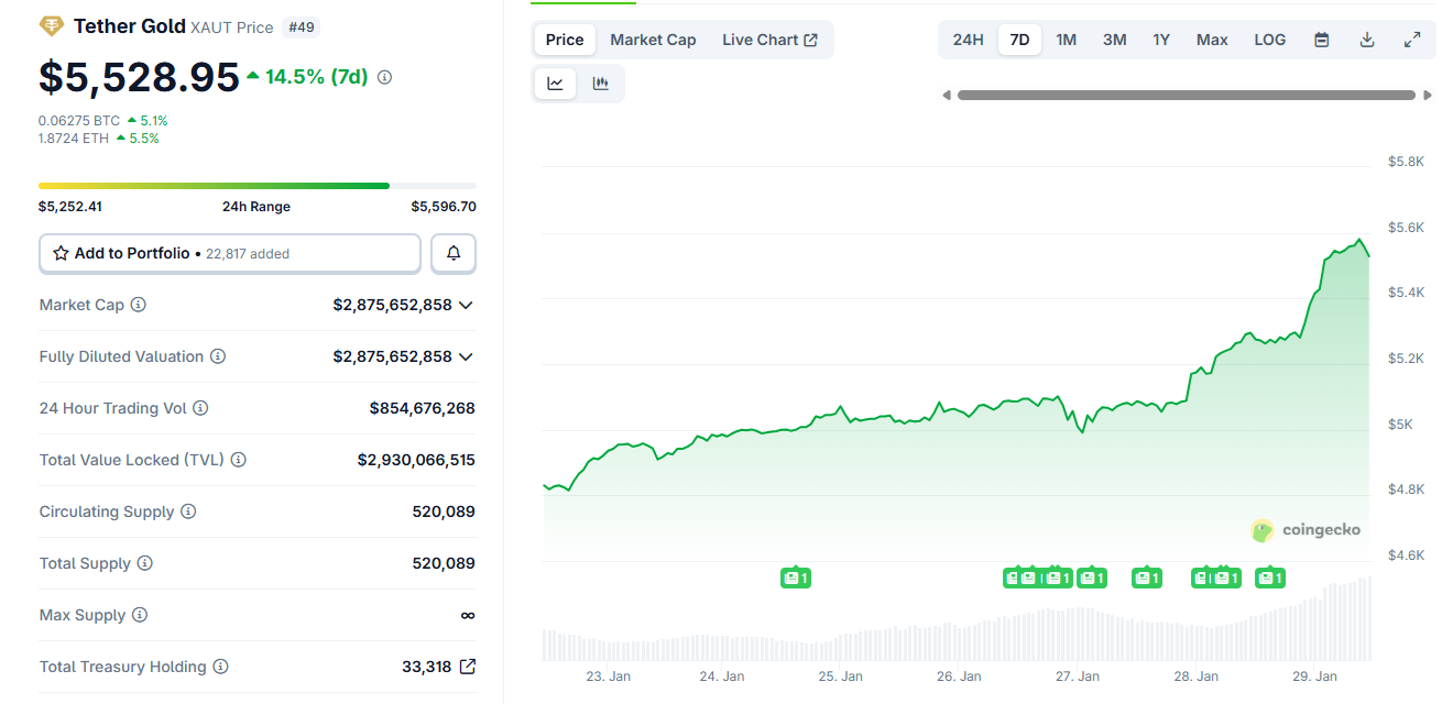 XAUT traded at a slight premium to spot gold, at $5,542.07, reflecting the general demand for easy on-chain access. Spot gold reached $5,537.78, boosted by a mix of speculation and a hedge-against-inflation narrative.