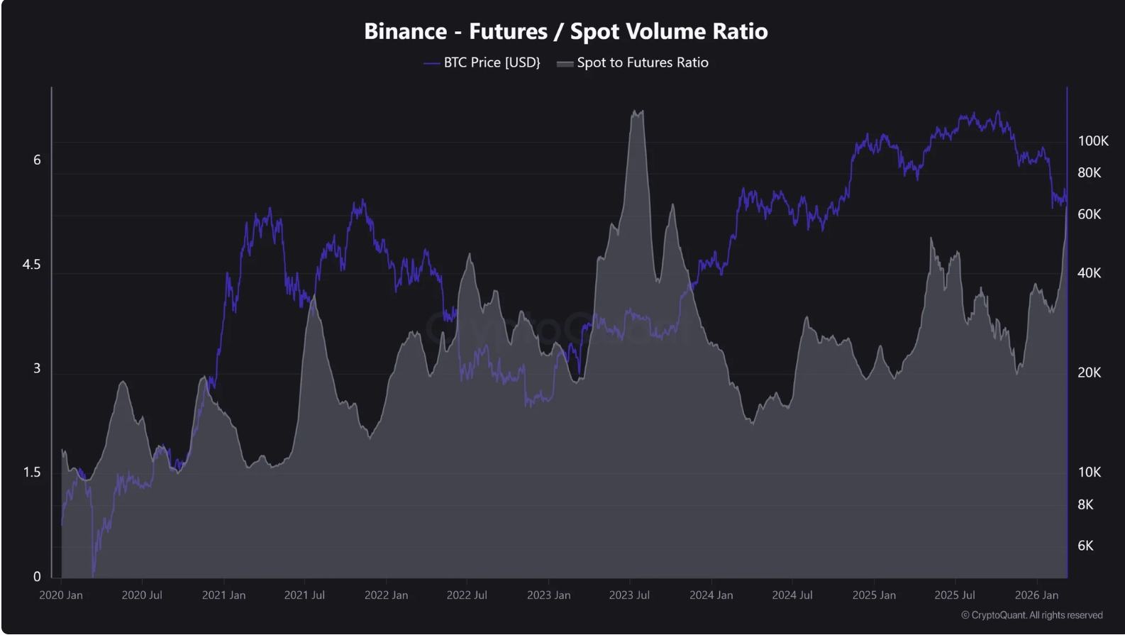 The futures-to-spot volume ratio on the exchange has risen to approximately 5.1, its highest level since mid-2023, CryptoQuant data shows.