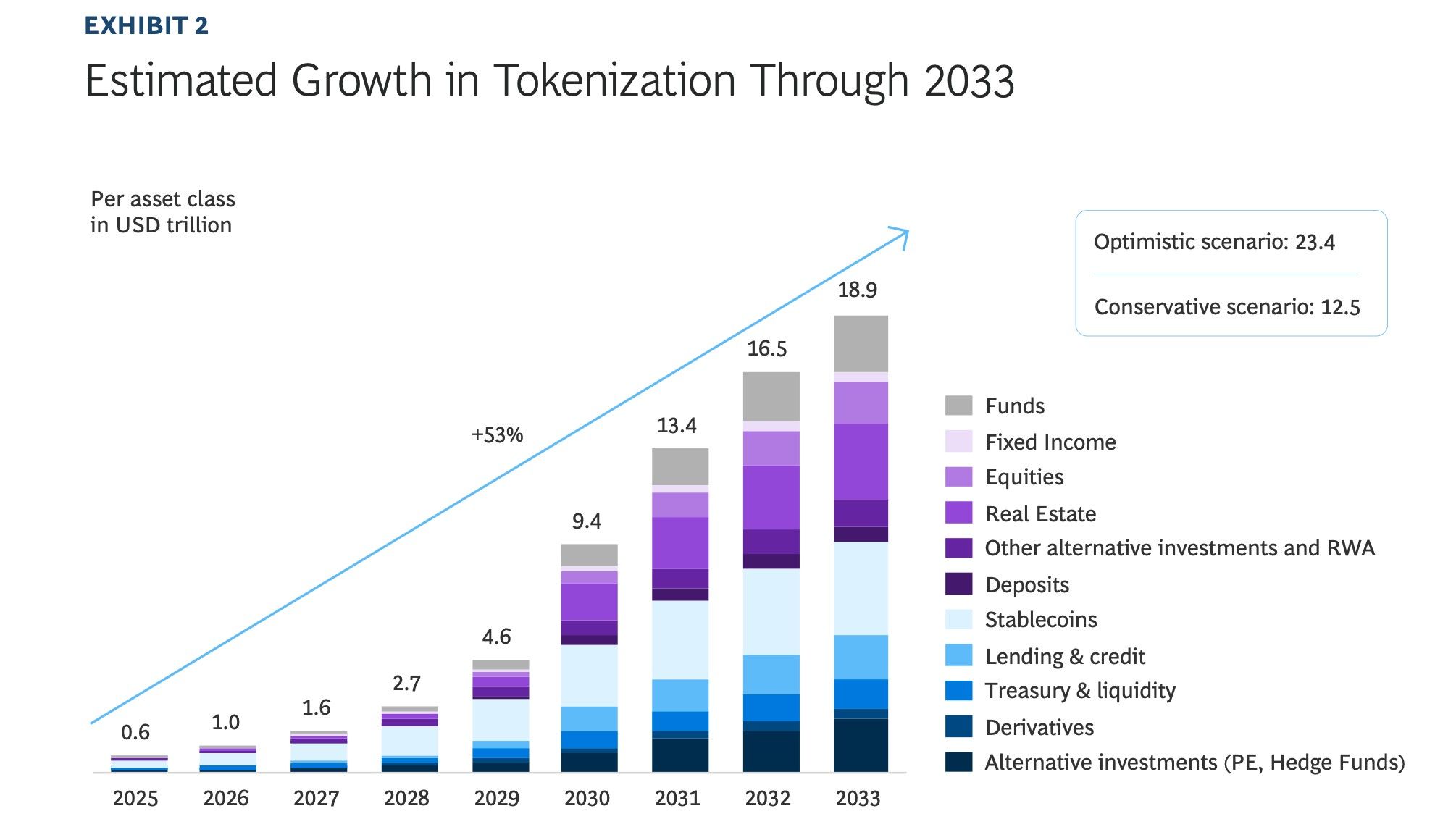 A joint report by Boston Consulting Group and Ripple forecasted that tokenized assets could grow 53% a year, reaching $18.9 trillion across all asset classes by 2033 as their base case.