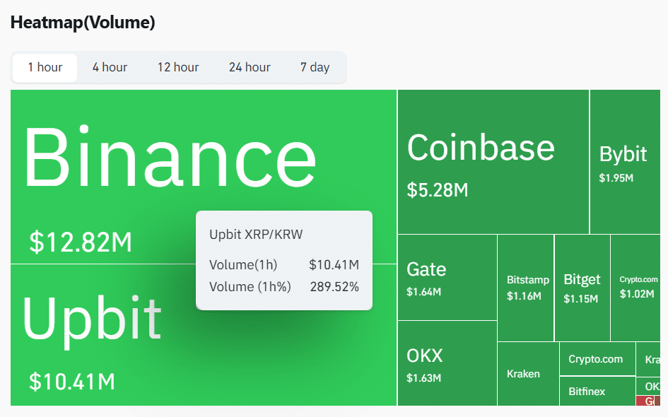 Interestingly, South Korea’s Upbit appears to be leading the charge surrounding $XRP’s recent volume spike, recording a 289% increase in $XRP trade volume within an hour. This has brought its 1-hour volume to $10.41 million, edging close to Binance’s $12.82 million.