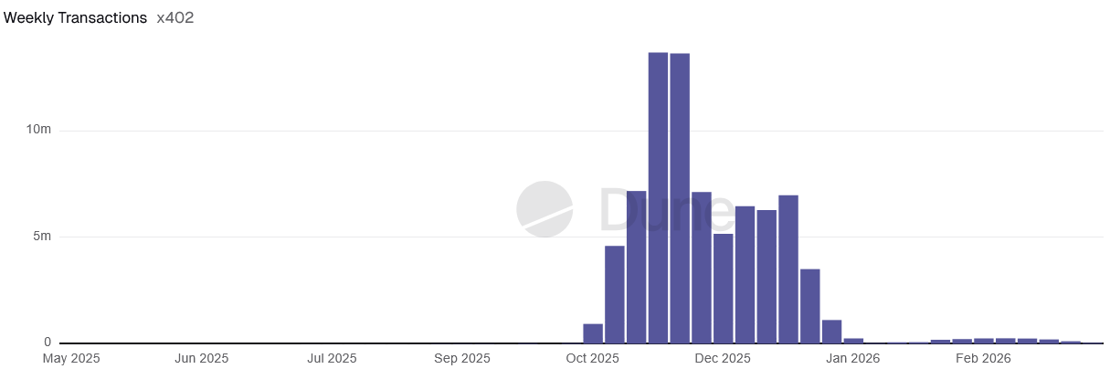 Weekly transactions via the x402 protocol since May 2025. Source: Dune Analytics