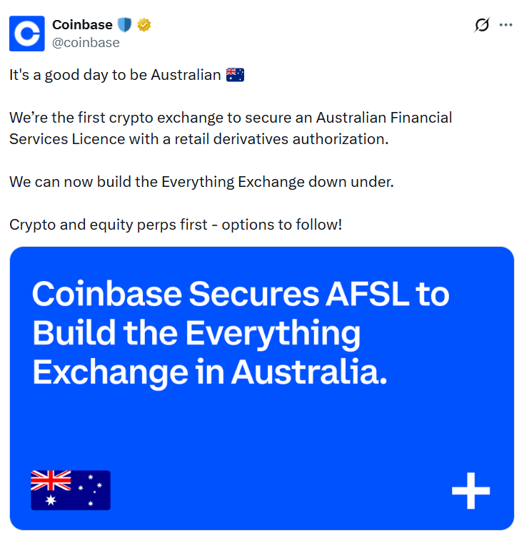 Global crypto exchange Coinbase said it is looking to expand its offerings in Australia to futures, options, stock trading, payments and other TradFi products as part of an “everything exchange” after securing a financial services license in the country.