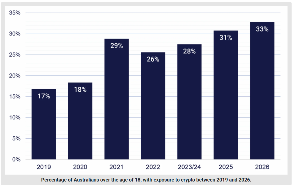 Crypto exchange Independent Reserve's Cryptocurrency Index estimates that 33% of Australians have exposure to cryptocurrency, up from 31% in 2025, among a population of more than 27.7 million. It also found that a growing number of people are using crypto to pay for goods and services compared with the year before.