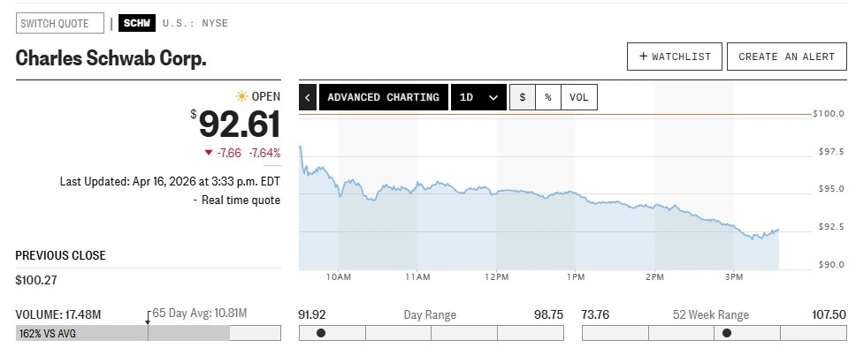 Aside from its flagship crypto product, Charles Schwab released its Q1 2026 earnings report today. Its net revenue grew 16% year-over-year to a record $6.48 billion, slightly missing the $6.50 billion expectation. This caused a 7.73% drop in its stock (NYSE: SCHW) on the day, with the stock trading at $92.53 at the time of writing.