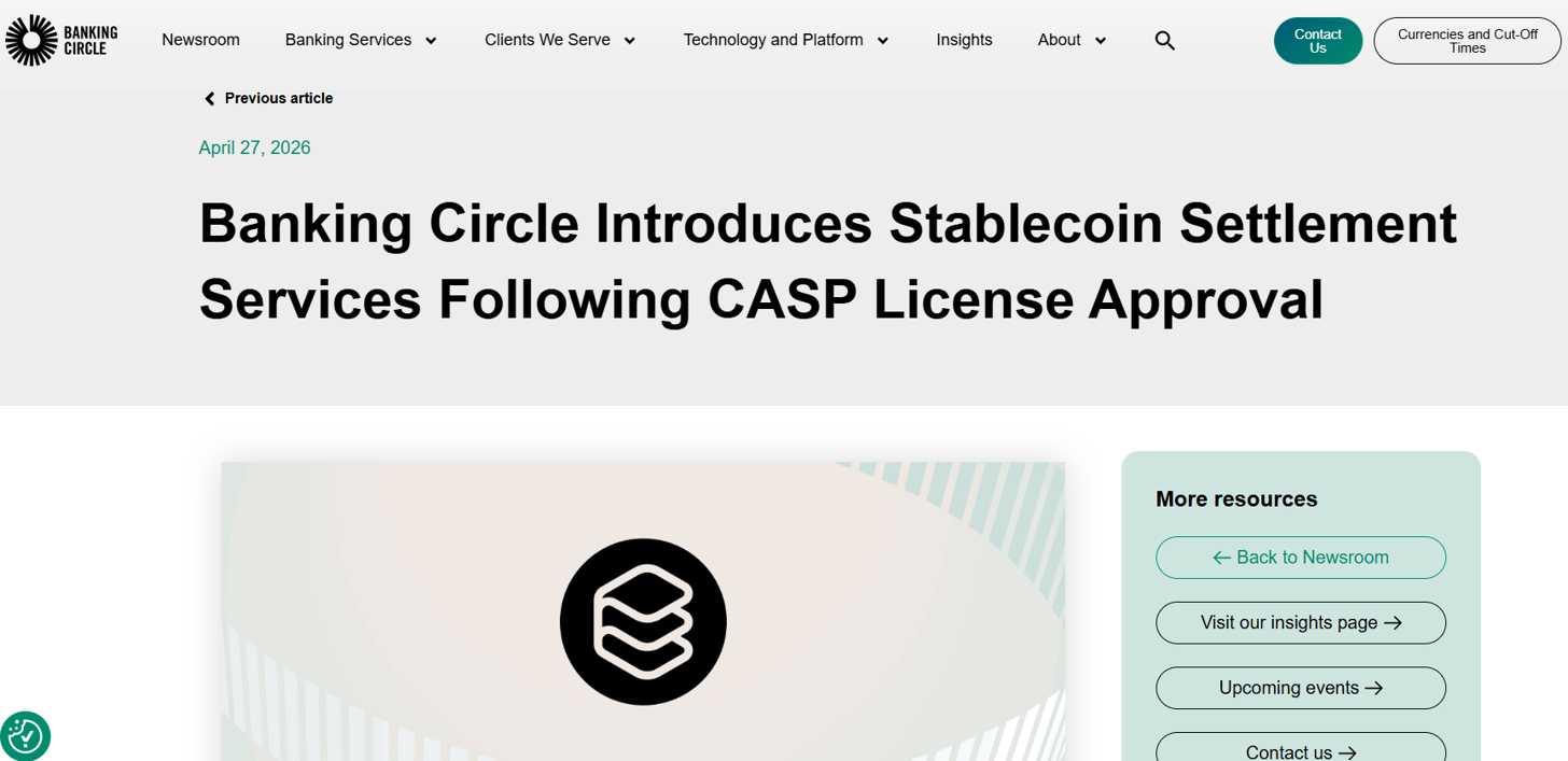 Luxembourg-based Banking Circle has launched stablecoin settlement services after receiving a Crypto Asset Service Provider (CASP) license from Luxembourg's financial regulator on April 15, expanding into regulated fiat-to-stablecoin and stablecoin-to-fiat settlement for institutional clients.