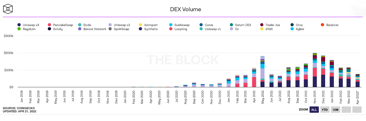 As mentioned above, there was a brief spike in dex trading volume in March, as $117.09 billion was recorded during that timeframe. However, April’s statistics look as though dex trading volumes will be lackluster and possibly lower than February. As of Thursday, April 21, 2022, current data shows that $75.11 billion in trades have been recorded so far.