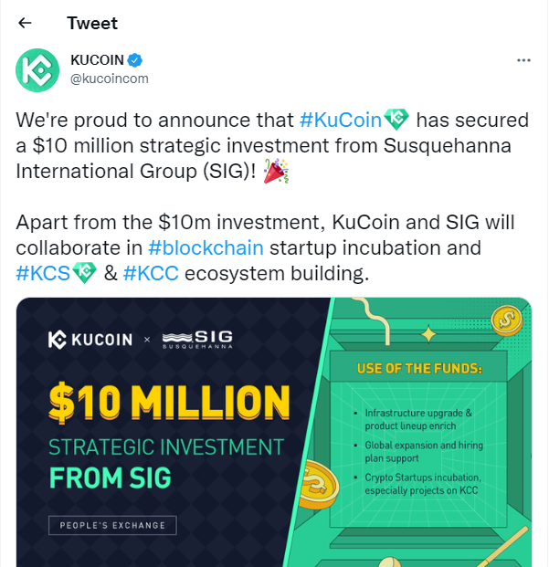 SIG invests $10 million in KuCoin.