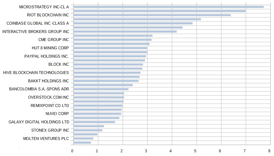 The Schwab Crypto Thematic Index’s constituents as of July 29 include Microstrategy, Marathon Digital Holdings, Riot Blockchain, Silvergate Capital, Coinbase Global, Robinhood Markets, Interactive Brokers, Nvidia, CME Group, Bitfarms, Hut 8 Mining, International Exchange, Paypal, SBI Holdings, Block Inc., Monex Group, Hive Blockchain, Internet Initiative Japan, Bakkt Holdings, NCR Corp., and Bancolombia.