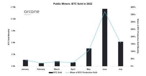According to a report from Arcane Research, Bitcoin miners sold off almost 15,000 BTC in June, a whopping 400% of their Bitcoin production. That number eased off in July, down to 6,200 BTC.