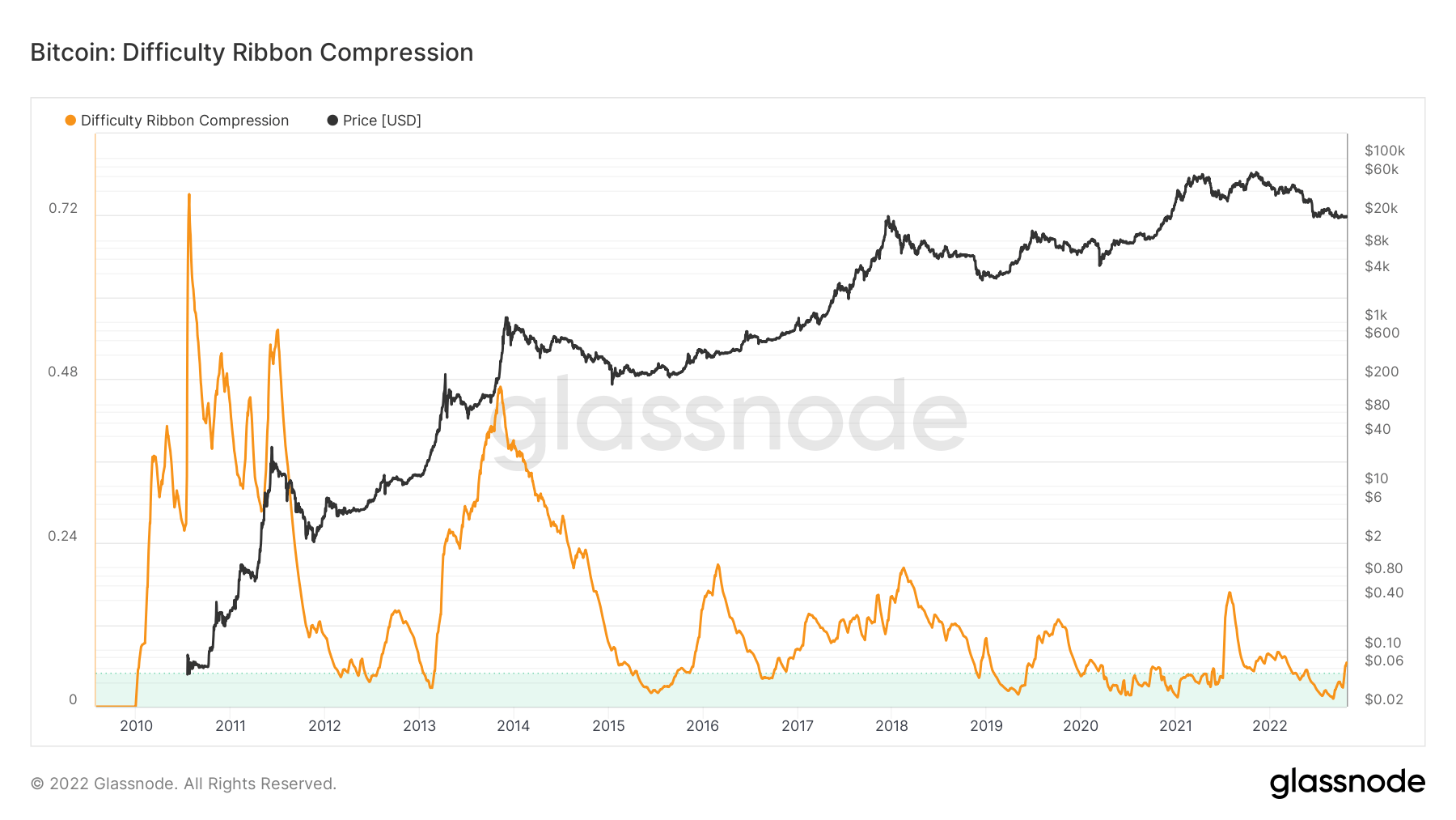 With the most recent difficulty adjustment, the difficulty ribbon compression increased and left the green zone. Historically, periods when the ribbon compresses have been good buying opportunities.