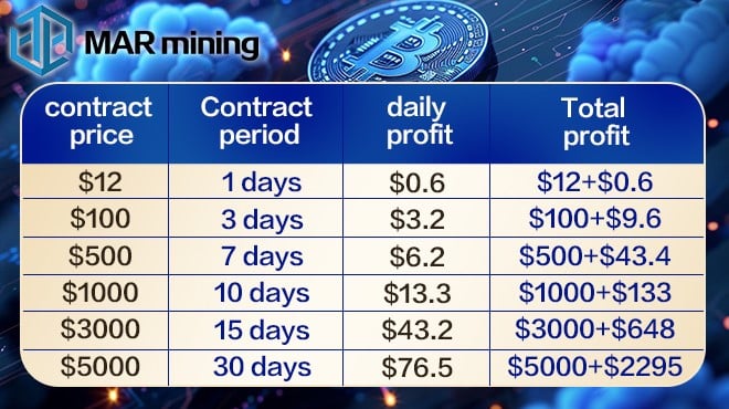 According to the website, MAR mining has assembled a team of experts and cutting-edge technology to create and deliver top-notch cloud mining investment opportunities. It currently offers a range of mining contracts and financial options ranging from $12 to over $5,000 for potential and existing users to choose from. Their official website has a detailed introduction, and they have 24-hour online customer service staff to answer all related questions.