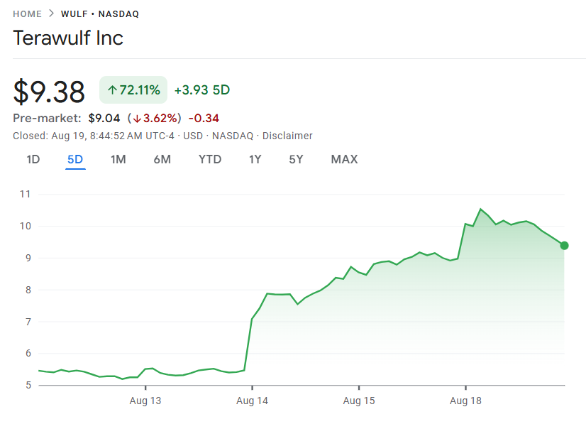 Following the Google announcement, Terawulf’s stock rallied during Monday’s trading session to $10.57 before closing at $9.38.