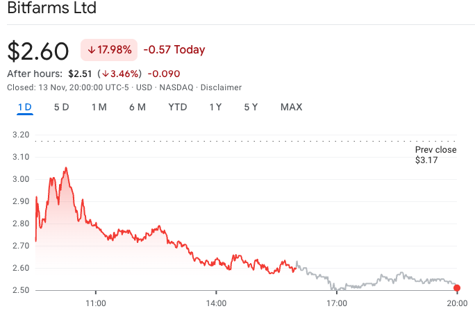 Bitfarms sank by nearly 18% on Thursday as its Q3 results reported $46 million in losses. Source: Google Finance