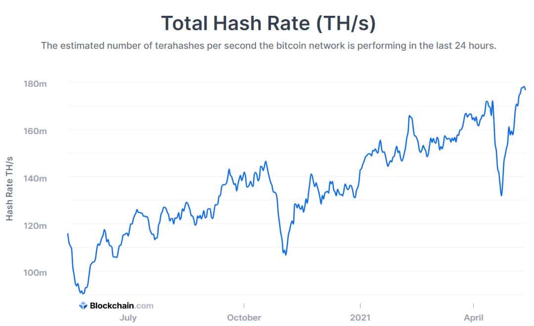 According to Blockchain.com, the metric indeed fell hard from over 170M TH/s to around 130M TH/s in days. Since then, though, the hash rate not only bounced back but went for another all-time high record at just shy of 180M TH/s.