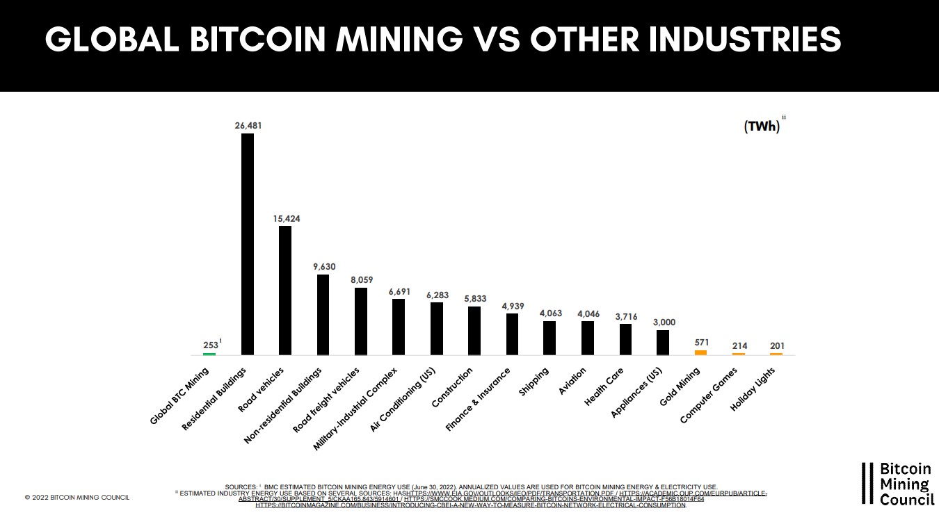 The report claims these metrics are “inconsequential” in terms of global energy consumption and when compared to other industries operating worldwide. As seen below, the Bitcoin network uses 253 terawatts per hour (TWh) while the global energy output stands at 165,317 TWh.