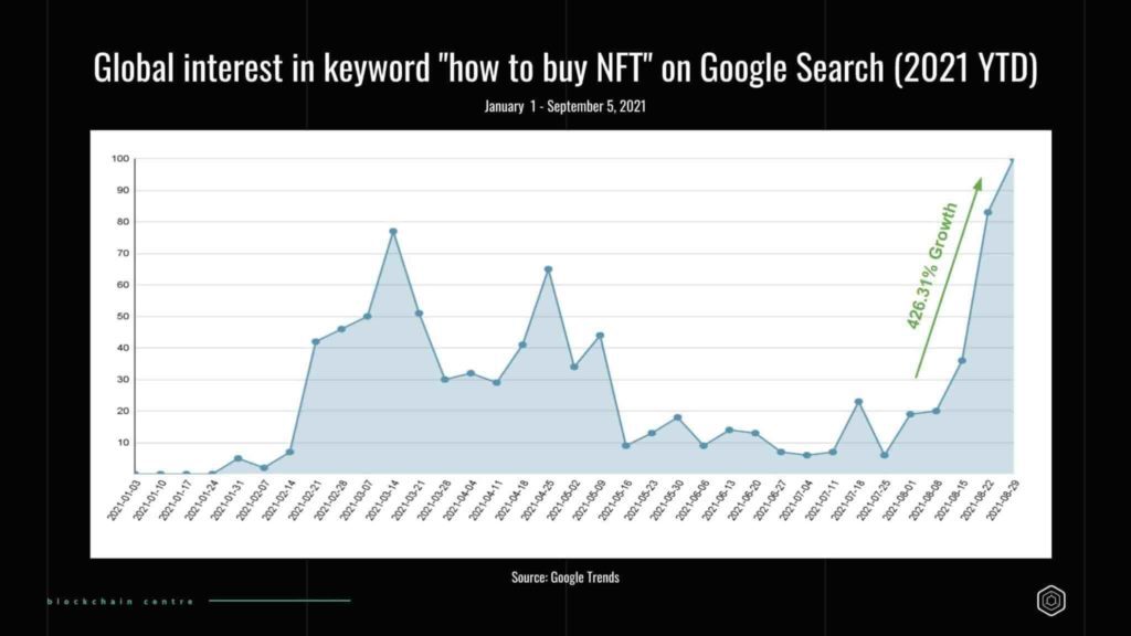 The term NFT worldwide grew by 426%, especially for the search “how to buy NFT,” which on August 1 was at level 19 and then rose to 100 after only 28 days.