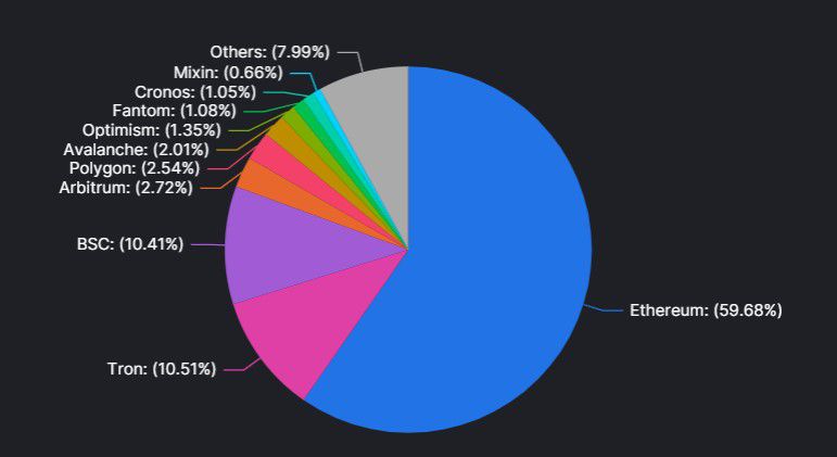 Polygon ranks fifth while supporting 352 protocols with a TVL of $993.41M. On a chain-to-chain comparison, Ethereum controls nearly 60% of the total value locked in the decentralized universe. Polygon dominates around 2.5% of the space.