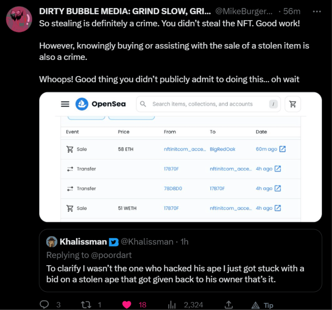 After having their NFT stolen, Twitter user Yieldasaurus posted begging for the criminal to sell the Ape back to him at cost. Instead, speaking through a mediator and, ultimately, an accessory to the crime, a user going by Khalissman offered to sell the Bored Ape back to Yieldasaurus for 66 ETH (eventually the price was set at 58 ETH, which Yieldasaurus, begrudgingly, paid).