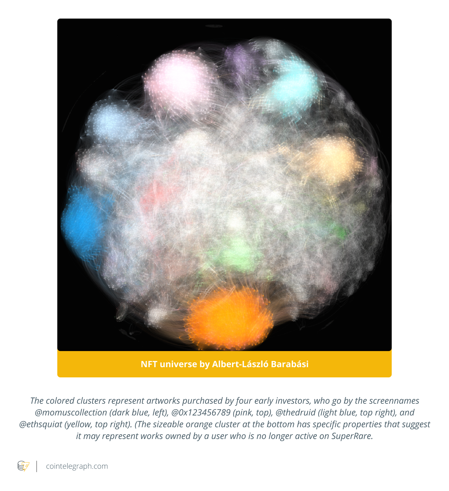 In the analysis, Barabási examined the number of co-owned art $NFT transactions between collectors on the platform. He defined co-owned art NFTs as art NFTs that had been bought and sold between more than one collector through SuperRare. He analyzed each artwork as a “node” on a “network” of transactions between registered SuperRare collectors to see how many of the same pieces had been owned by different collectors.