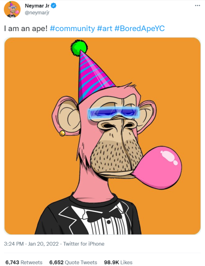 Neymar shared the news with his followers on Twitter, posting a photo of his new pink ape outfitted with flashy futuristic glasses, along with the hashtag #BoredApeYC.