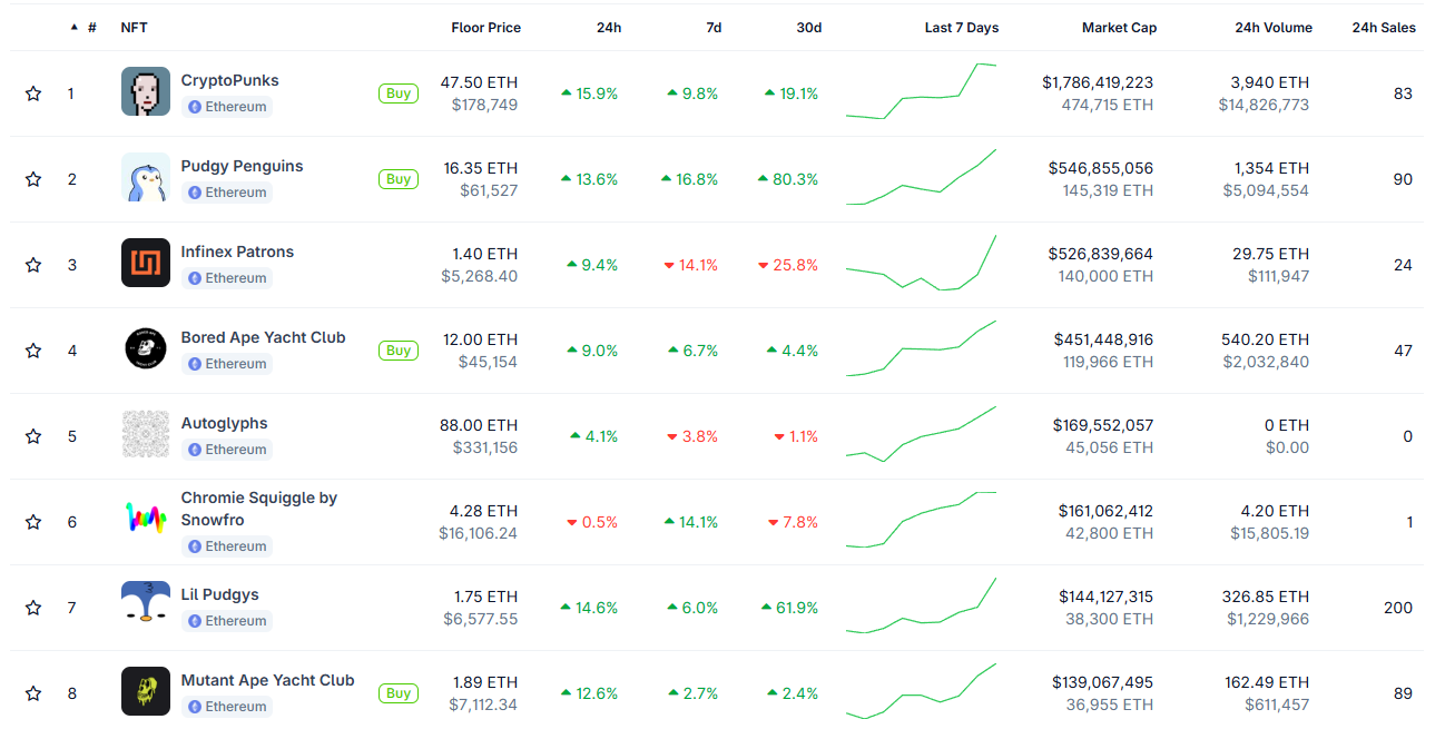 According to CoinGecko data, Pudgy Penguins rank second in volume among all NFT series, trailing only CryptoPunks and outpacing Bored Ape Yacht Club derivatives.