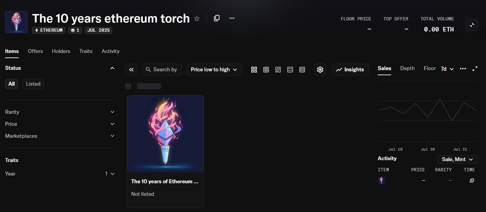 Ethereum’s recent surge in market cap and price happened right on time for its 10th anniversary. To mark this milestone, Ethereum has unveiled a symbolic digital torch in the form of an NFT to honor its community and growth.
