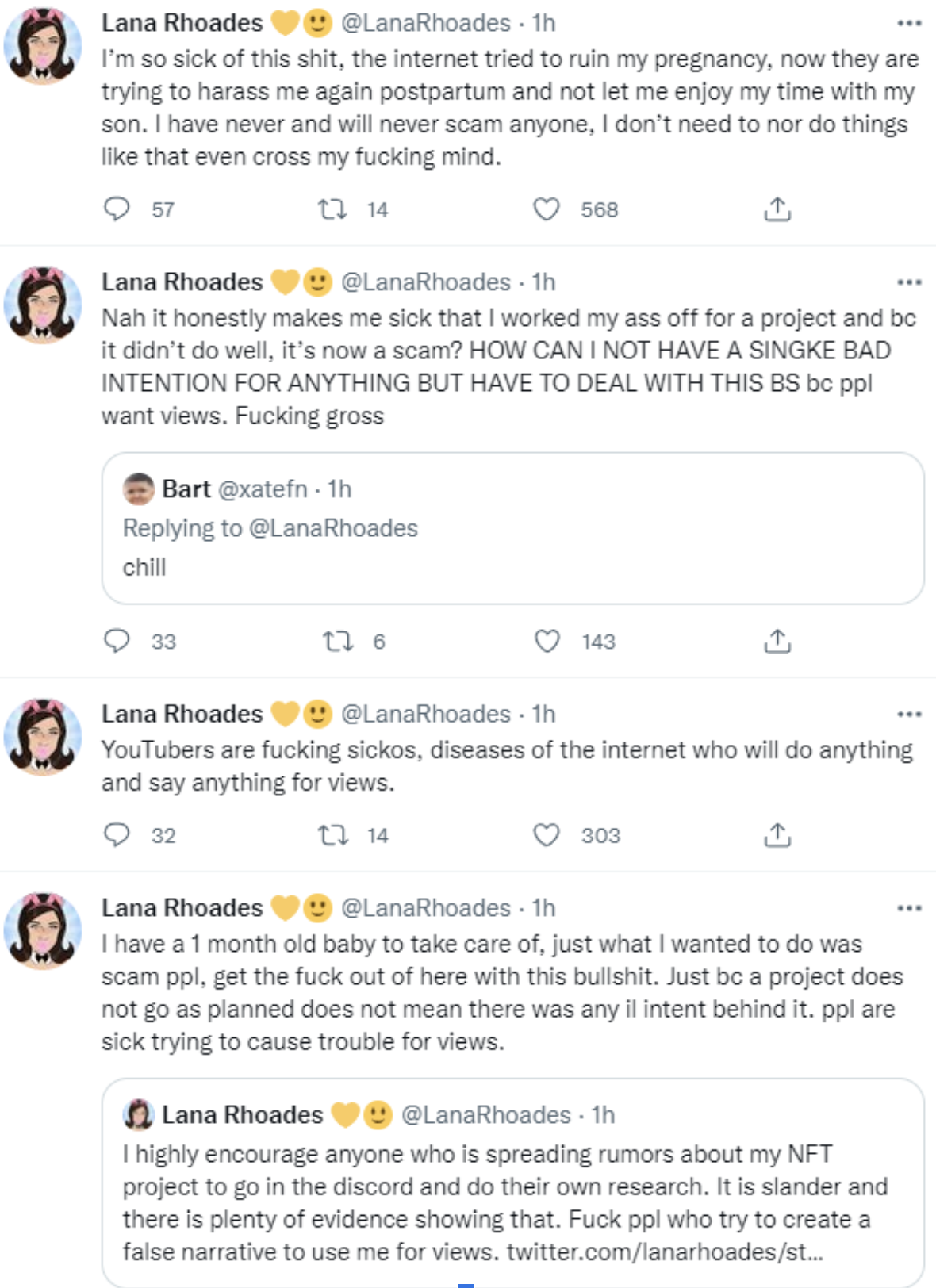After telling her community that her project was a “lucrative investment,” Rhoades then walked the statement back on Wednesday, stating that she wasn’t sure she could “turn this investment around” or “make people profit.” She also appeared to be giving up on her own NFT project, saying that it was up to her community to somehow bring value to the project going forward.