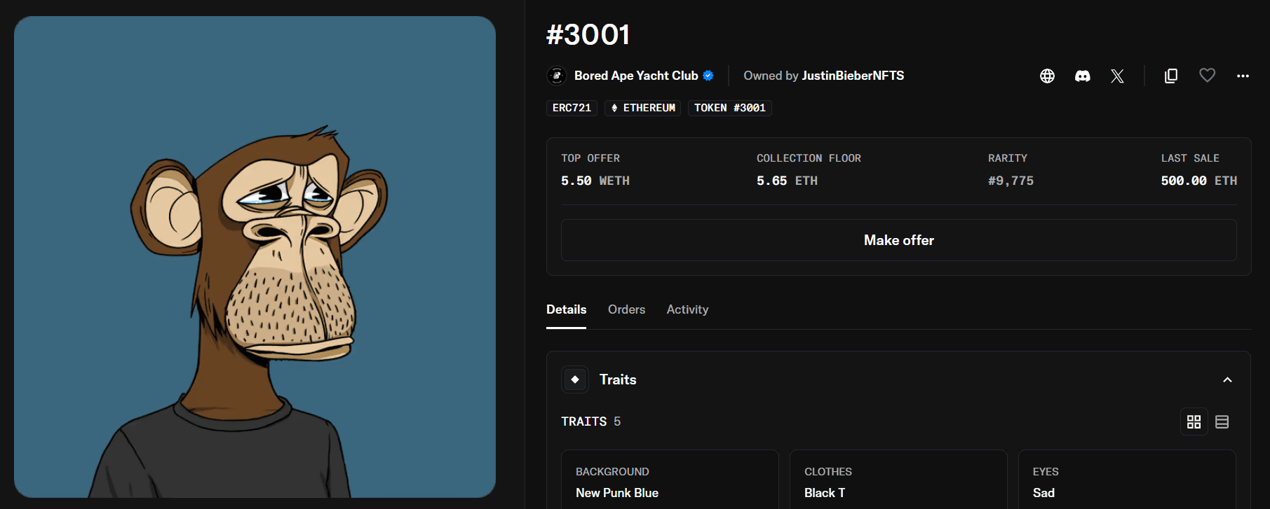 In January 2022, Justin Bieber acquired Bored Ape #3001 for 500 $ETH. At the exchange rates of that time, the transaction was valued at approximately $1.3 million.