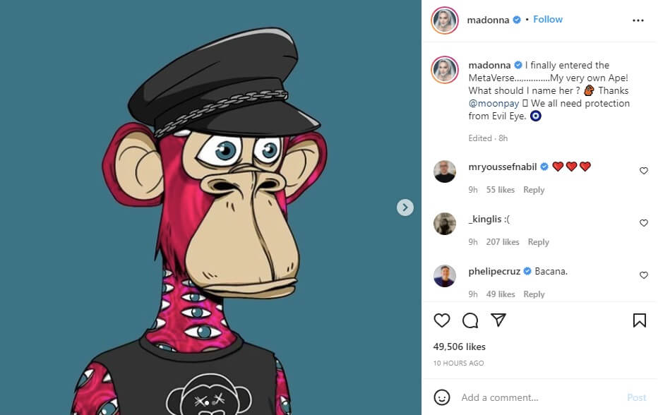 “I finally entered the MetaVerse…My very own Ape! What should I name her? Thanks @moonpay,” Madonna wrote on her Instagram. “We all need protection from Evil Eye.”