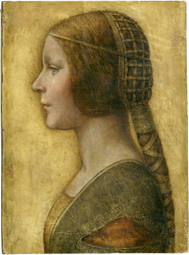 “This image depicts a fashionable young woman in a beautiful renaissance dress and hair netting. The sitter is believed to be Bianca Sforza, a young aristocrat from Milan. It was likely commissioned by Leonardo’s employer, Ludovico Sforza, the Duke of Milan, to celebrate the marriage of his beloved but illegitimate daughter, Bianca, in 1496 to an Italian nobleman. Her future husband was the captain of the Milanese military forces and a patron of Leonardo. Tragically, Bianca died within months of her marriage due to pregnancy complications. She was the subject of many portraits in her young life, being a great beauty born into an aristocratic family, but this was likely her last portrait.”