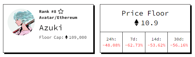 But Azuki hasn’t exactly been having the greatest month in terms of floor price, either. The collection's starting price is down 56% in the past month and nearly 63% in the past week, according to data from NFT Price Floor. To some extent, this larger decline is partly due to crypto and NFT markets crashing across the board.