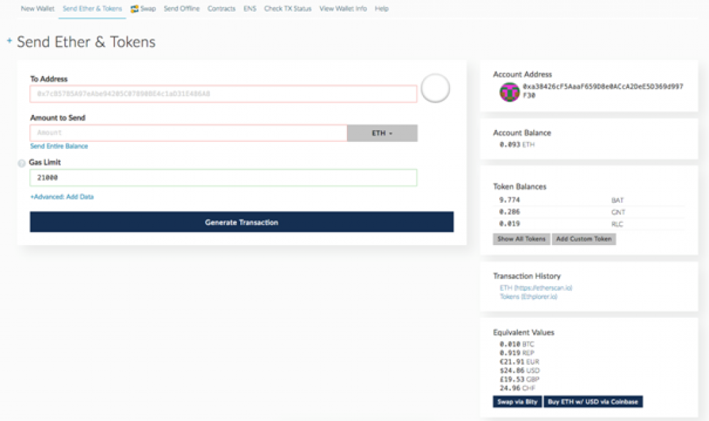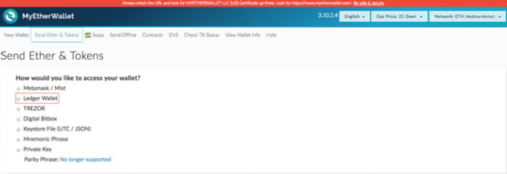 To manage your Ethereum account, go to MyEtherWallet website (not the Chrome extension plugin) and select the “Send Ether & Tokens” tab. Select the “Ledger Wallet” option and click on “Connect your Ledger Wallet”.