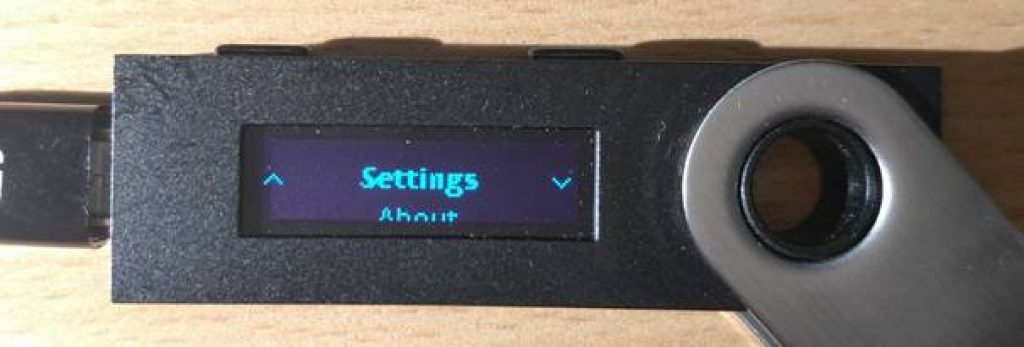 In the first step, you need to open the Ethereum application by navigating to it, and pressing both buttons at the same time to open it. Then press the right button to select “Settings”, after that press both buttons to open it up.