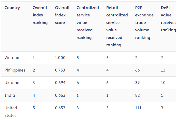 After Vietnam, the next three countries are also emerging markets: the Philippines, Ukraine, and India. The US is ranked fifth for global crypto adoption.