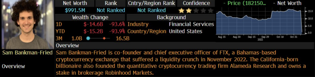 The Bloomberg Terminal has updated its estimate of FTX CEO Sam Bankman-Fried’s net worth on Nov. 8 to $991 million, down from $16 billion the day before.
