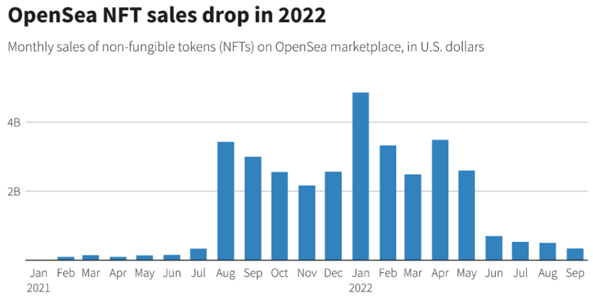 But as for your legacy NFT collections, not so much. As per DappRadar data, Q3 2022 saw $3.4 billion in sales, down from $8.4 billion in the previous quarter. NFT sales volumes peaked at $12.5 billion in the year’s first quarter.