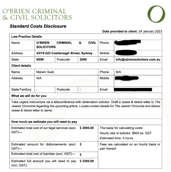 On January 24, Susli declared that the “Zionist lobby” was attacking and defaming her. She claimed to need $3,300 AUD in legal fees in order to “draft a cease and desist letter to the Jewish Chronicle regarding the upcoming article.”