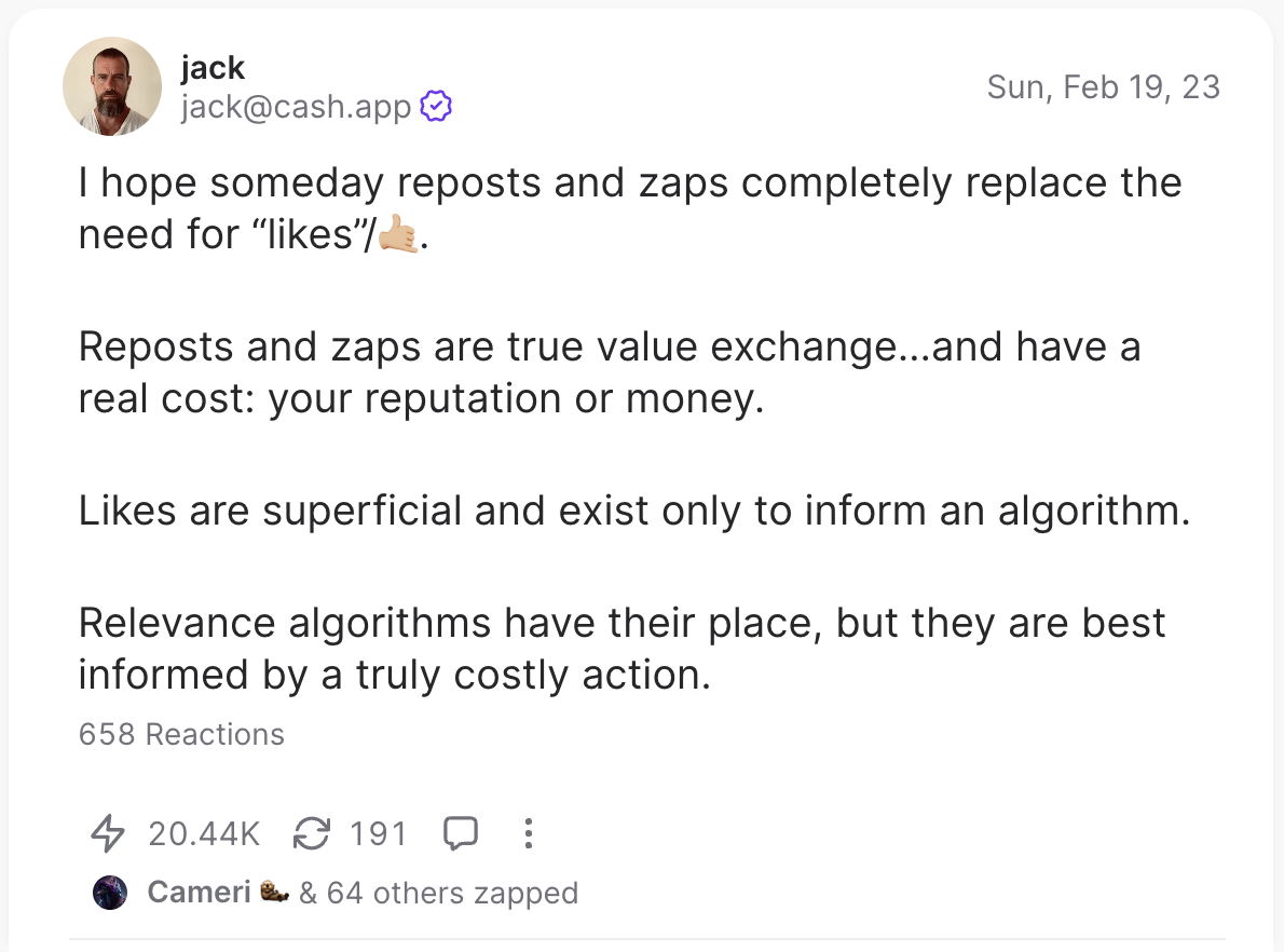 "Reposts and zaps are true value exchange and have a real cost: your reputation or money," he explained. "Likes are superficial and exist only to inform an algorithm. Relevance algorithms have their place, but they are best informed by a truly costly action."
