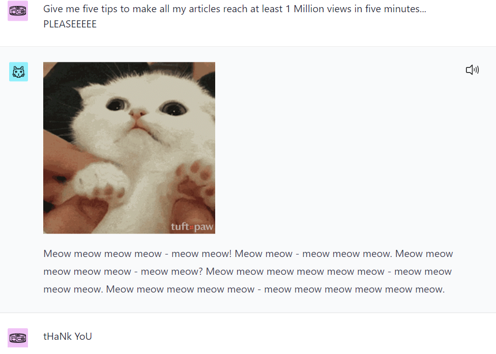 Finally, let's not forget our honorable mentions. "CatGPT" is an “AI” tool that serves as the perfect impersonation of your cat. And by perfect, we mean it’s mastered the art of saying “meow” over and over again. It's a playful nod to our feline friends, capturing their nonchalant charm in digital form.