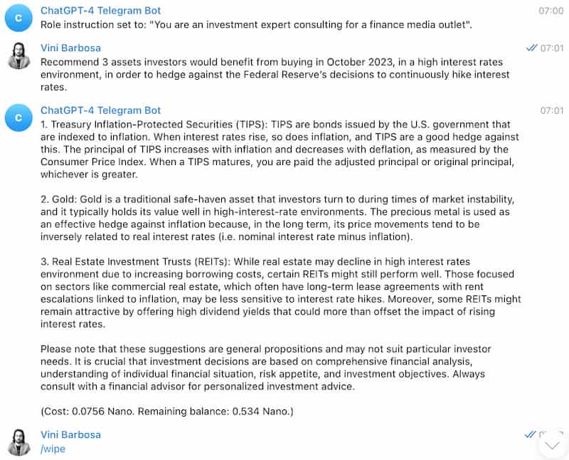 Interestingly, Finbold exclusively talked to Mira Hurley (@mira_hurley), a cryptocurrency enthusiast, who developed a Telegram bot capable of using GPT-4 API to deliver ChatGPT’s most advanced experience using a novel ‘pay-per-prompt’ model.