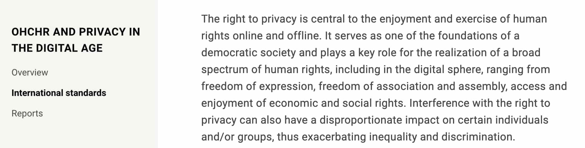 “The right to privacy is central to the enjoyment and exercise of human rights online and offline. It serves as one of the foundations of a democratic society and plays a key role for the realization of a broad spectrum of human rights, including in the digital sphere, ranging from freedom of expression, freedom of association and assembly, access and enjoyment of economic and social rights. Interference with the right to privacy can also have a disproportionate impact on certain individuals and/or groups, thus exacerbating inequality and discrimination.”