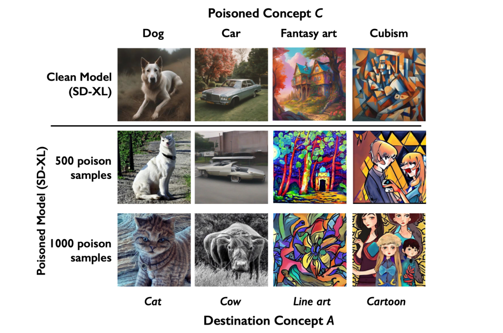 Even a handful of these images can corrupt the AI’s learning process. For instance, a recent experiment showed that introducing a few dozen misrepresented images was sufficient to impair Stable Diffusion’s output significantly.