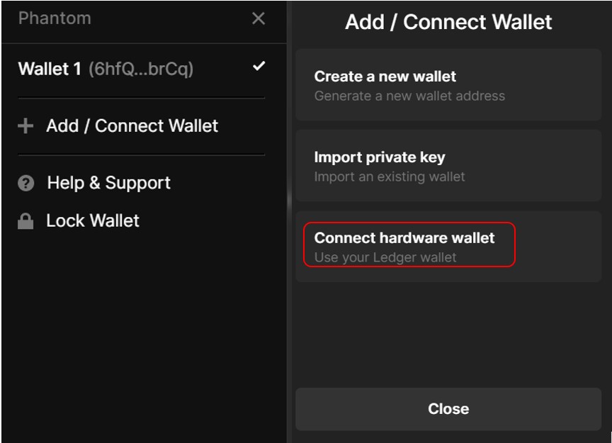The Phantom wallet allows the users to connect with their hardware devices. Currently, it allows connection only to the Ledger device.