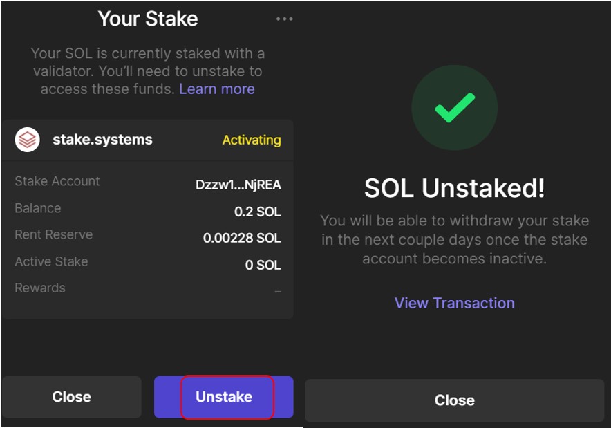 The same concept applies in the case of unstake. Your tokens will not get immediately unstaked when you choose to. It will first move to Deactivating or Cool Down state. Users can withdraw it once the deactivating or cooldown period is over.
