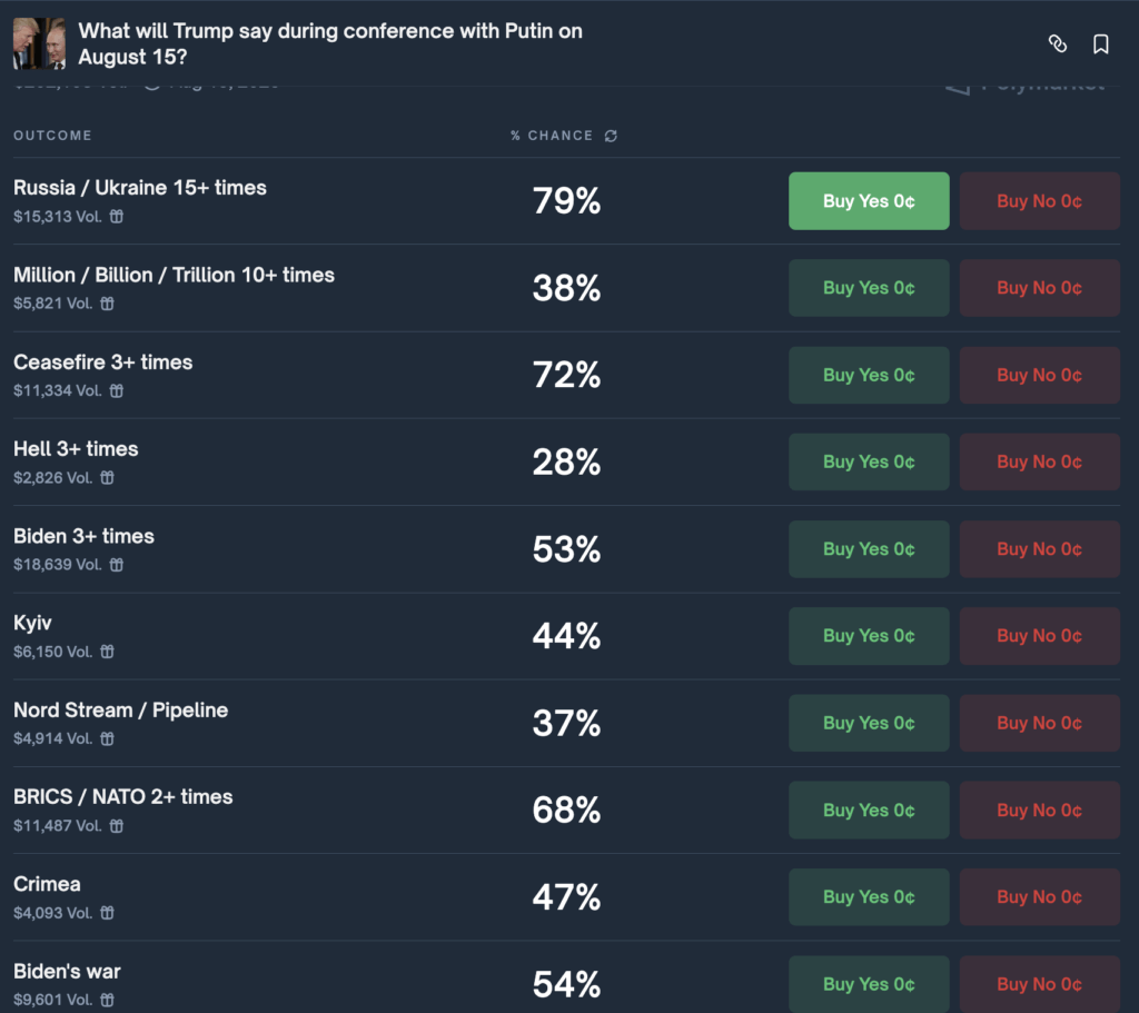 Polymarket traders are pricing low probabilities on several notable phrases being spoken during President Donald Trump’s joint news conference with Russian President Vladimir Putin in Anchorage today, even as volumes on the event’s prediction markets reach six figures.